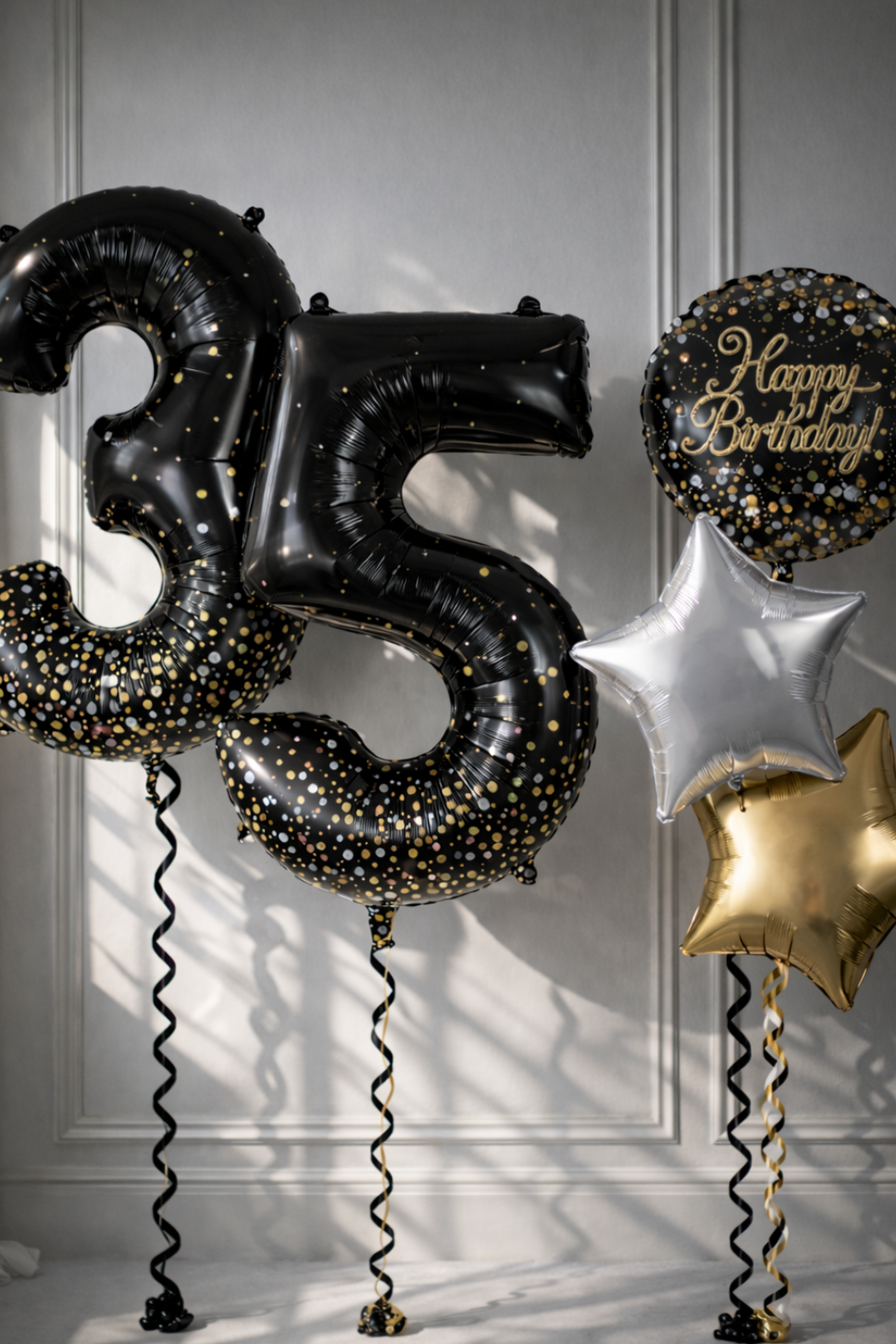 This nice little bundle includes the essentials for your birthday event. 2 x Large foil numbers helium filled and attached to weights in Black with Gold confetti dots. 1 x bouquet of 3 foil balloons helium filled and attached to a weight (1 x Printed / 2 x Plain foil stars). Choose your colour theme for the bouquet below. *Printed balloon may be different design to suit the chosen colour theme and/or age. (Product may differ slightly from image) If you require more bespoke colours please contact us.