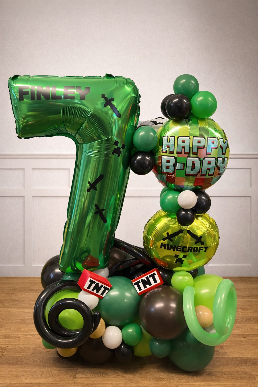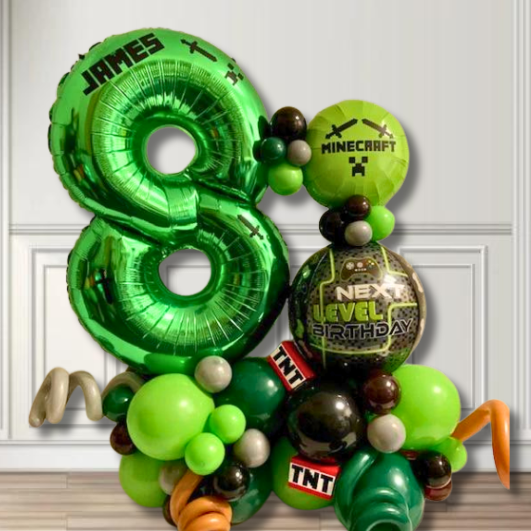 Mining Gamer themed Birthday Arrangement using any single digit age and an option to add a name to the number with no extra cost. Standing approx. 5 ft tall. 1 number, 1 18" balloon and 1 Orb all attached onto a base of latex balloons. Extra add-ons to create a more extreme look. (Product may differ slightly from image)