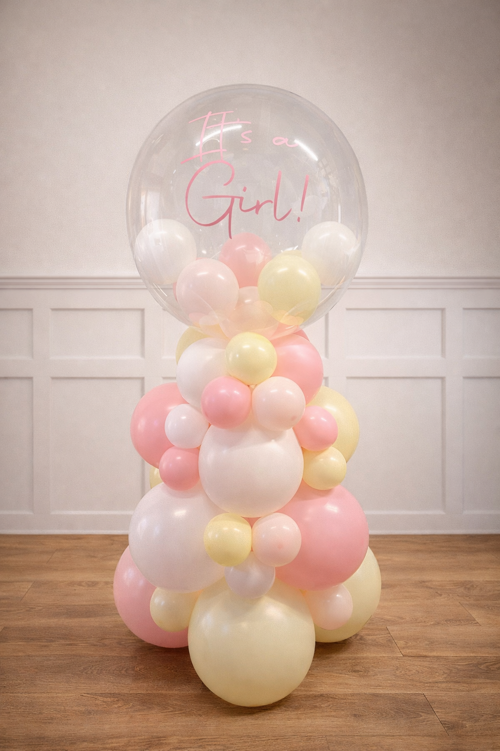 This Arrangement stands at approx 3.5ft Tall. 1 x Clear Bubble balloon filled with mini balloons and custom printed with wording of your choice, sat on an organic base made from latex balloons. (Product may differ slightly from image) If you require more bespoke colours please contact us.