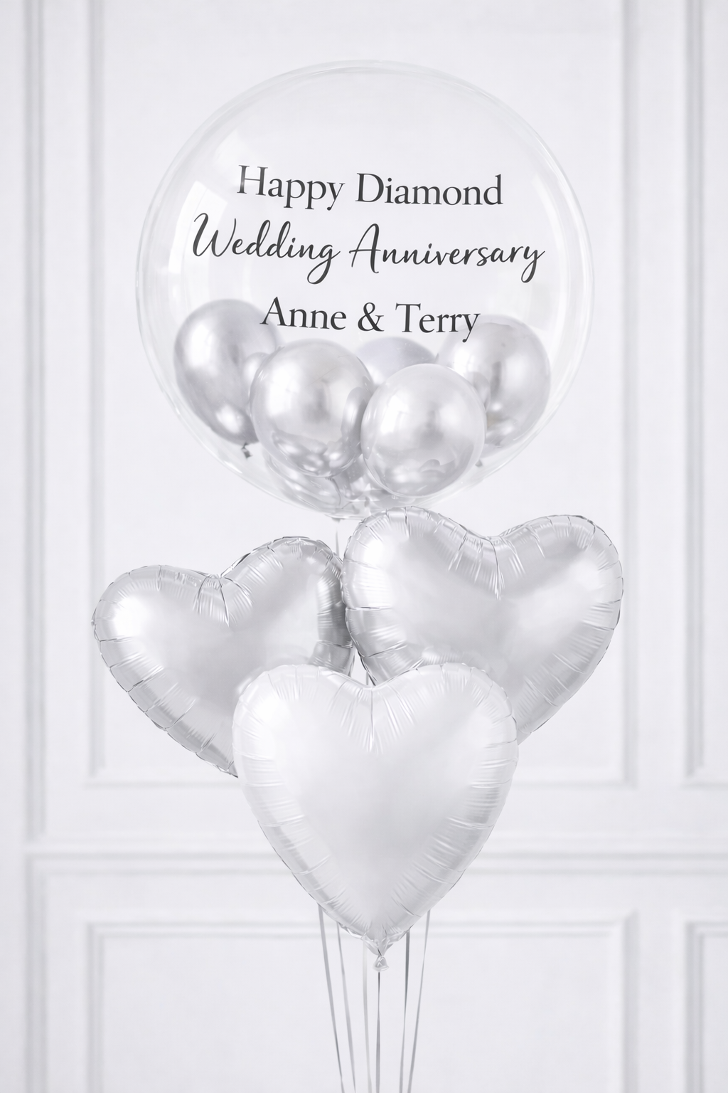 1 x Clear Bubble balloon filled with mini balloons inside, 3 x foil hearts, all helium filled and attached to a weight. Add your personalised message to be printed on the clear bubble balloon. (Product may differ slightly from image) If you require more bespoke colours please contact us.