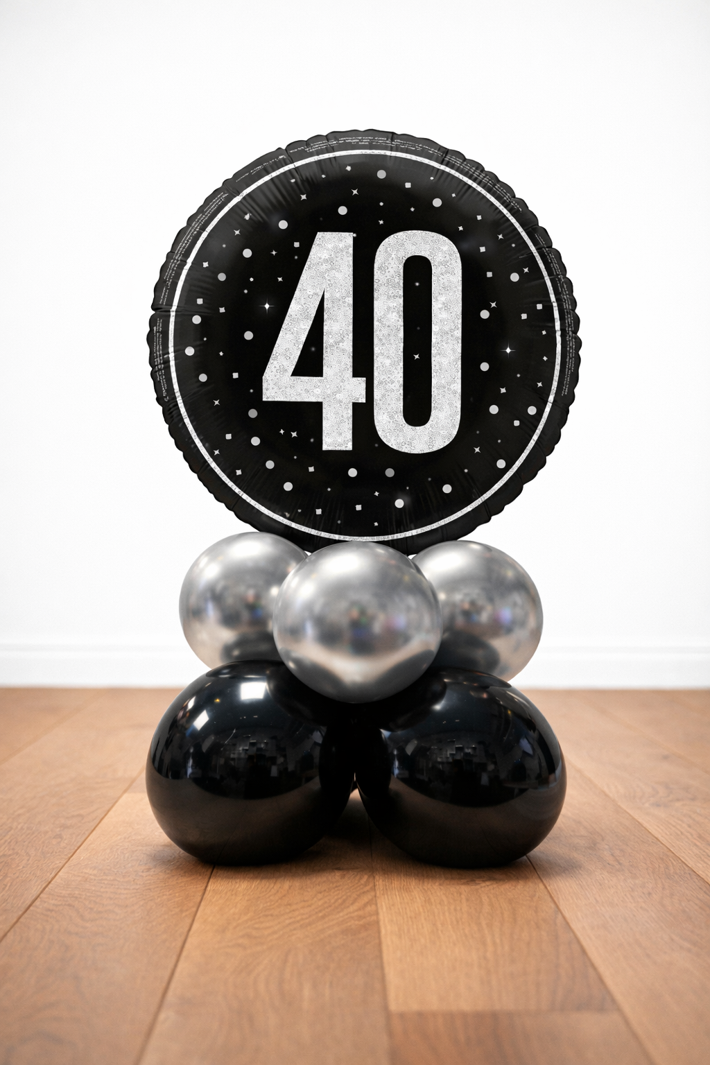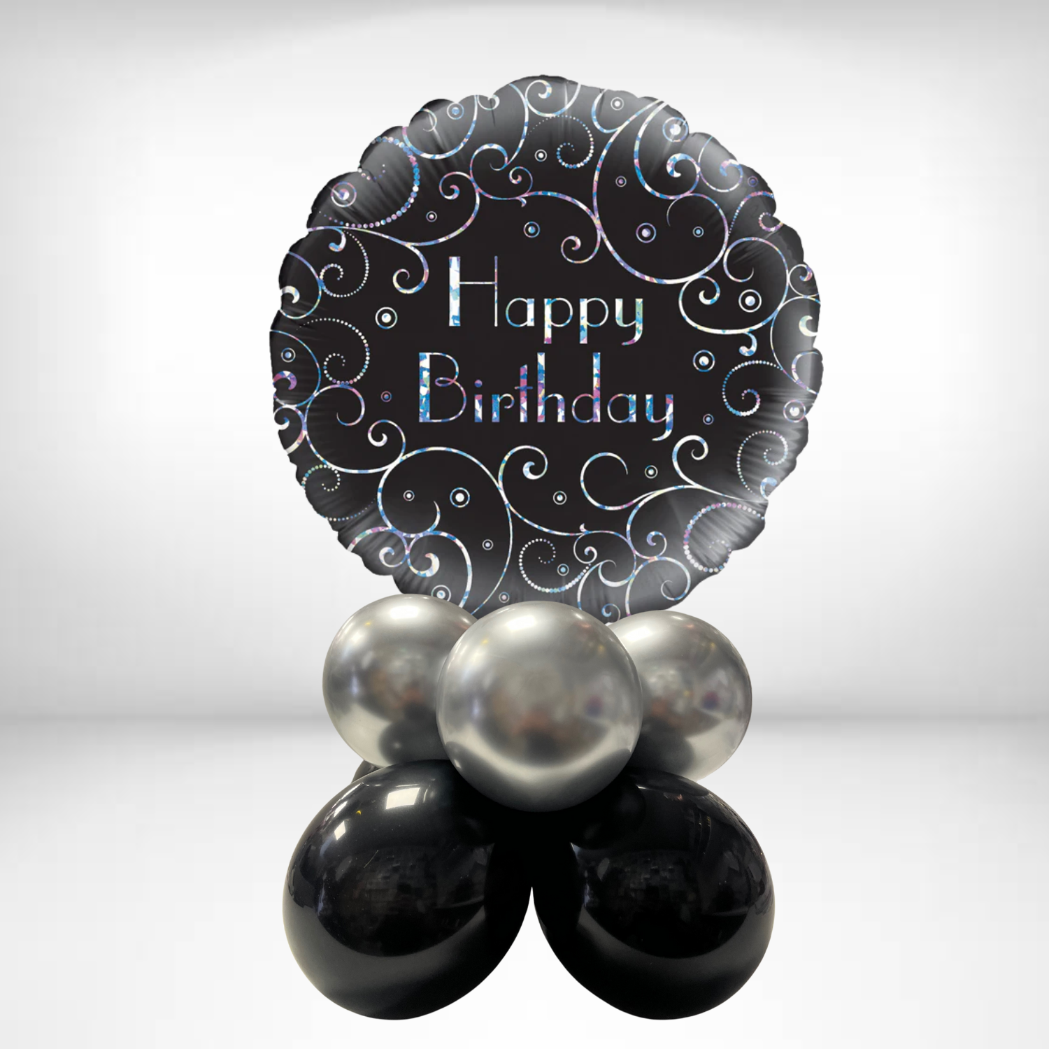 This is the perfect small balloon arrangement to decorate any present table, cake table or restaurant table. Small and understated, but slightly different to just a normal helium filled balloon. 1 x 18" foil balloon in Black & Silver on a base of mini balloons in matching colours. Whole arrangement is approx 50cm tall and fixed.