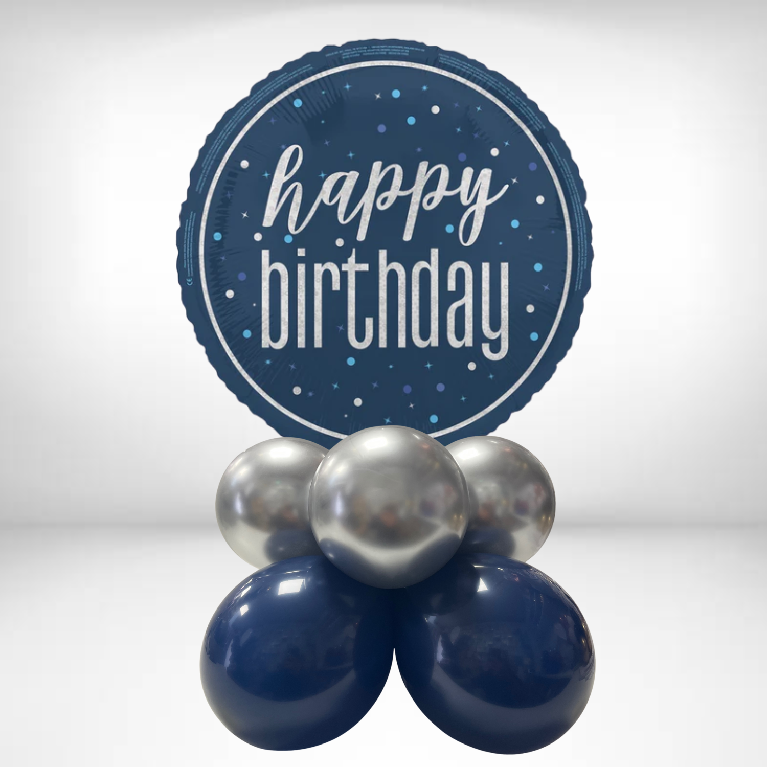This is the perfect small balloon arrangement to decorate any present table, cake table or restaurant table. Small and understated, but slightly different to just a normal helium filled balloon. 1 x 18" foil balloon in Navy & Silver on a base of mini balloons in matching colours. Whole arrangement is approx 50cm tall and fixed.