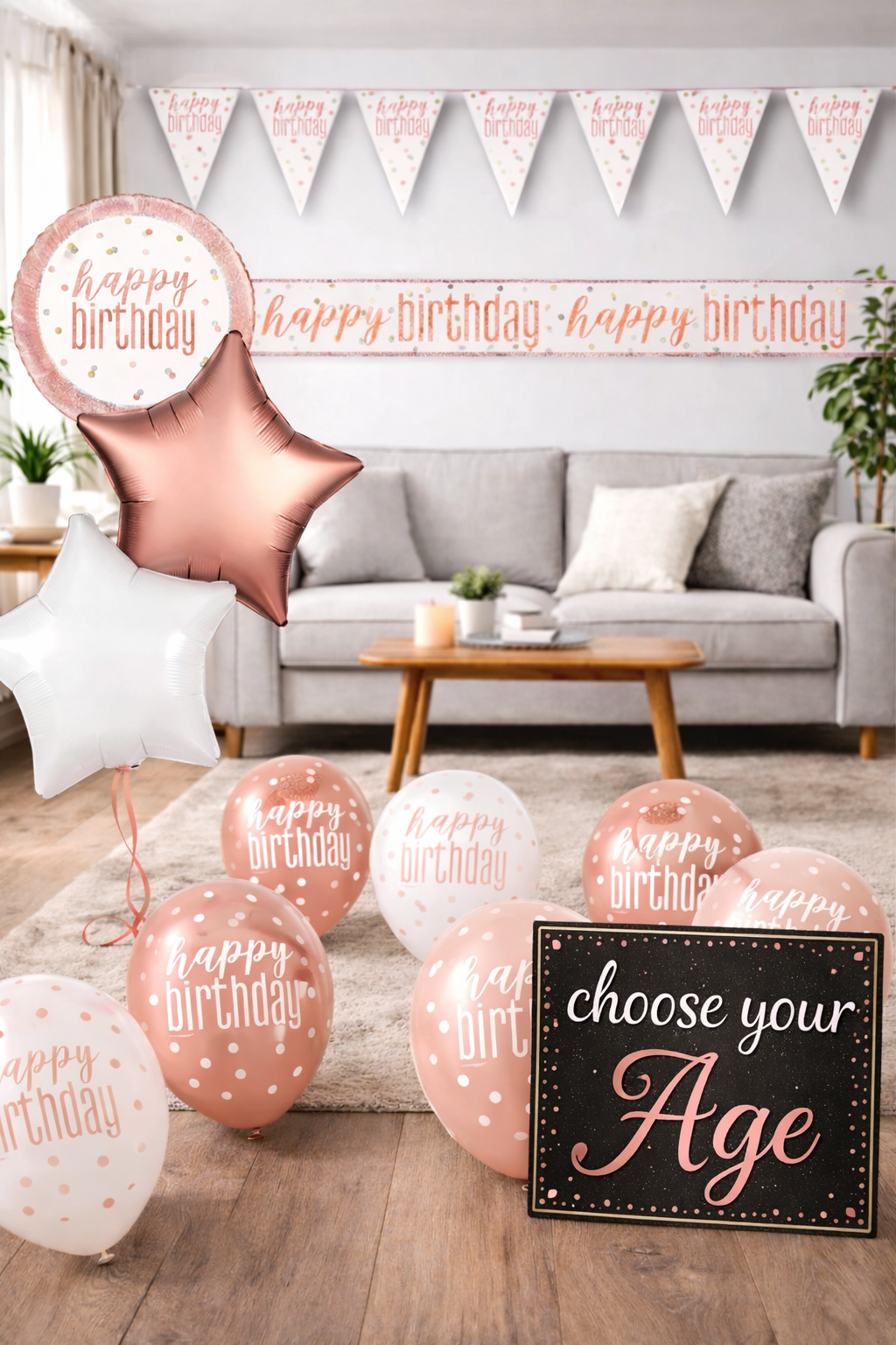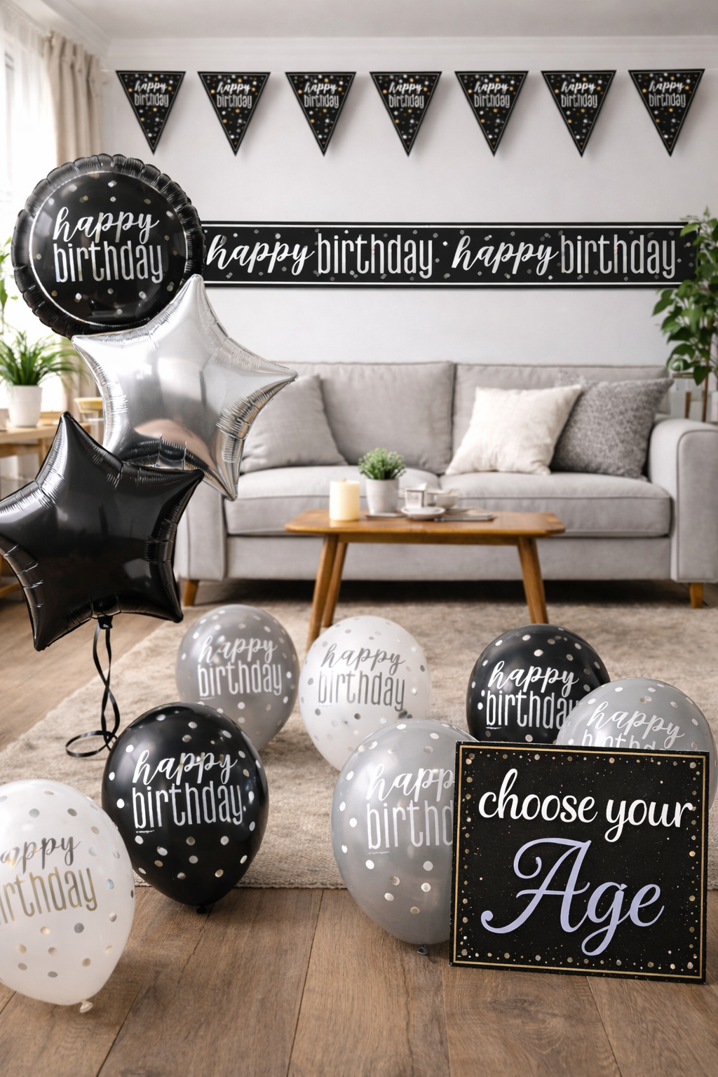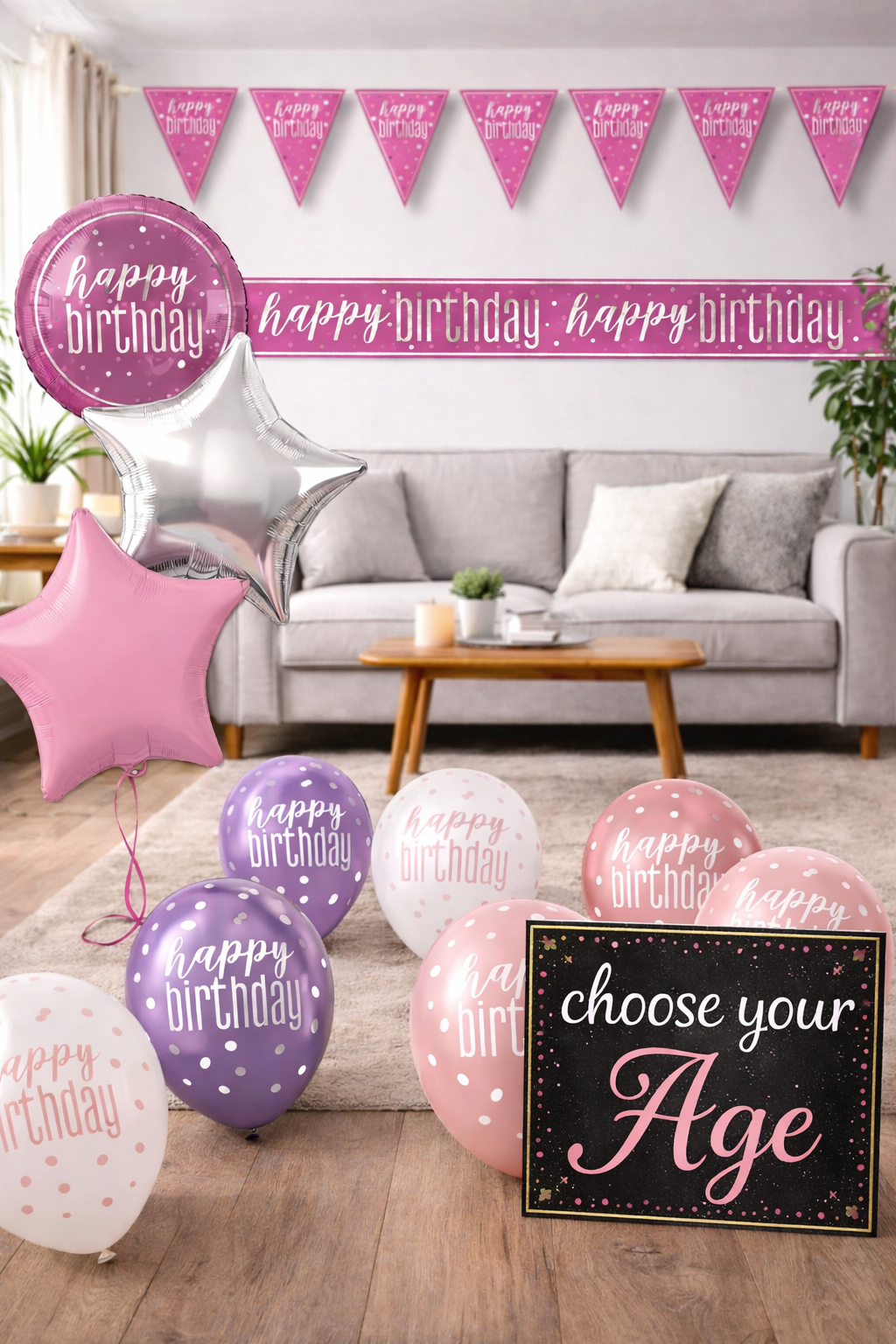 This party pack includes everything you could need to decorate an office, living room or bedroom for someones special day. Choose from either generic Happy Birthday or one of our milestone ages (13 all the way up to 90) and colour theme. If choosing a milestone age, everything will be age matched - bunting, banner, latex balloons and top foil balloon