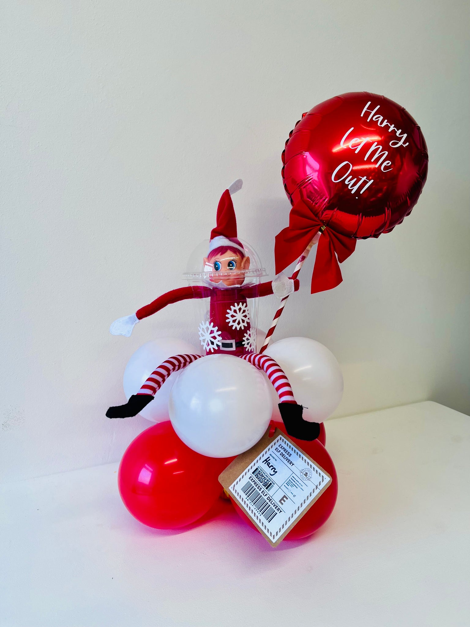 This Tabletop Arrangement includes: 1 x Plastic cup with a lid, filled with tissue paper and and elf stuck inside, attached to a small base of balloons in red and white and weighted. Your elf will be holding a small red balloon printed with 'Your child's name' and 'Let me out'. To top all of this off, it also has an 'Elf Delivery' courier label all the way from the North Pole and red satin bow. cups can also be filled with chocolates by yourself.